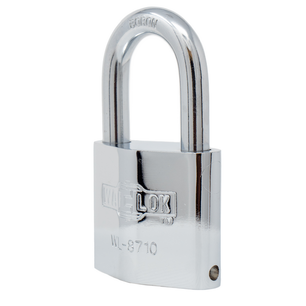 The WL-8710 Boron Shackle Padlock Chrome Plated 2-4/25" Wide Padlock case is made of extruded brass, and its shackle is made of hardened boron steel. Boron is a chemical element that can be added to steel to make it four times stronger. The padlock is chrome plated for a nice finish.